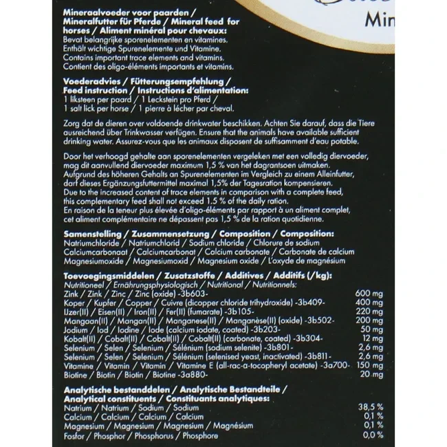 - Speciaal ontwikkeld voor paarden om te kunnen voldoen in de behoefte aan zout en de belangrijke sporenelementen en mineralen.
