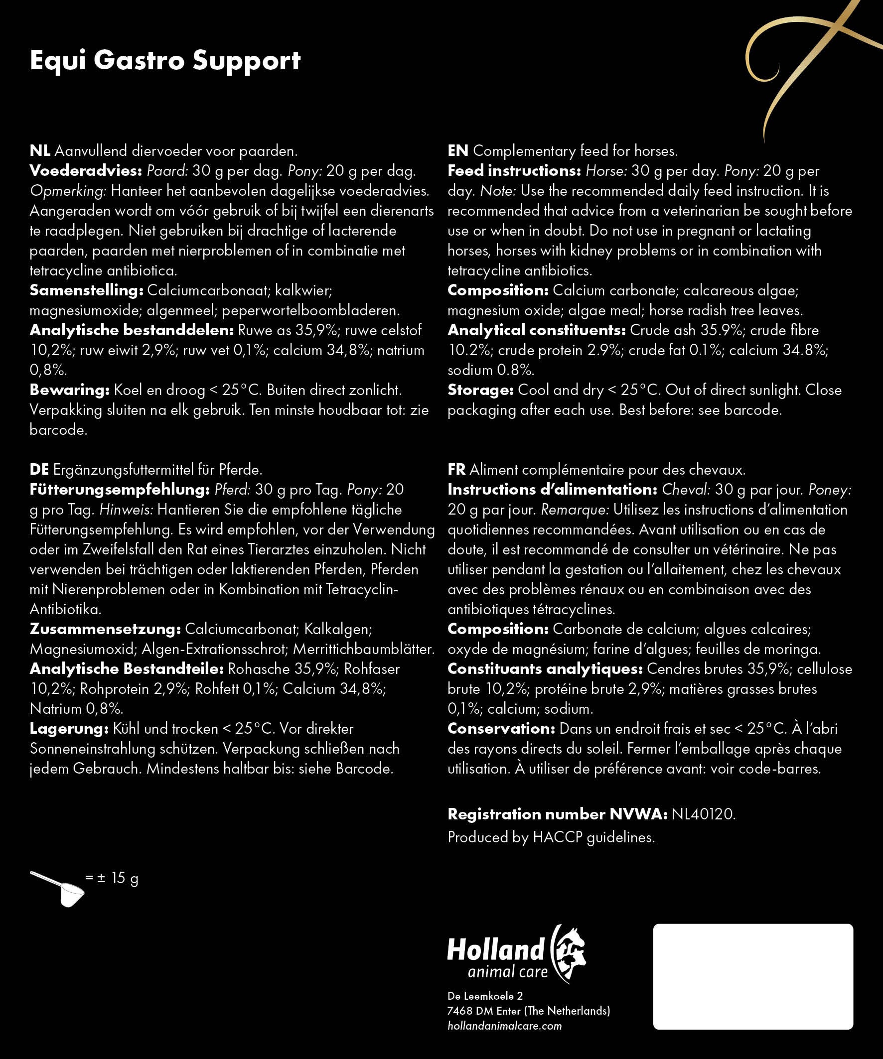 Equi Gastro Support bevat een unieke en effectieve samenstelling met specifieke ingrediënten. Kalkhoudende alg zorgt voor ondersteuning en behoud van een normale maagzuurgraad en het neutraliseren van overdadige maagzuurvorming. Calciumcarbonaat zorgt voor het neutraliseren van de maaginhoud om de maag tot rust te brengen.