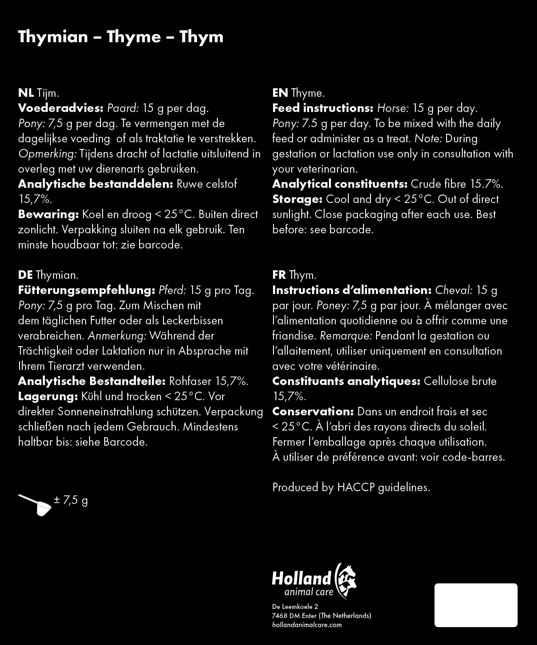 Tijm heeft een verzachtende invloed op de keel. Ook is het goed voor een normale darmfunctie en ondersteunt het de spijsvertering.