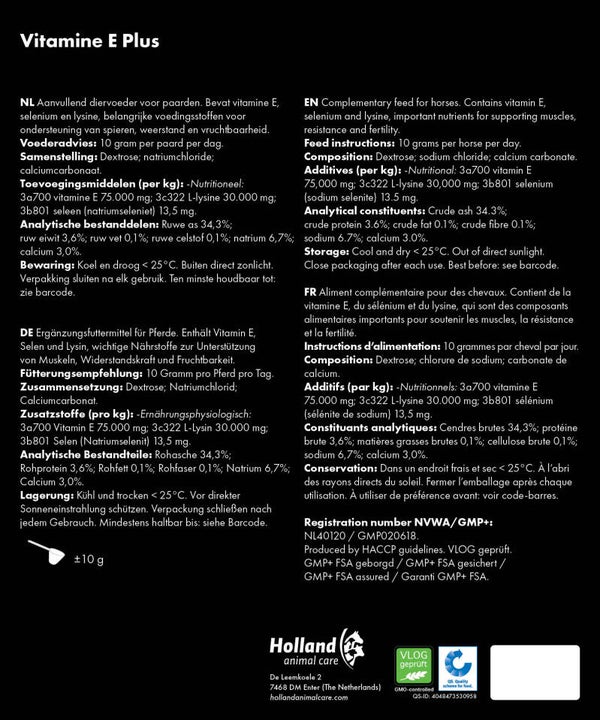 Vitamine E Plus is een uitgebalanceerde plus voeding met vitamine E, lysine en selenium. Dit zijn belangrijke voedingsstoffen voor de ondersteuning van spieren, weerstand en vruchtbaarheid.