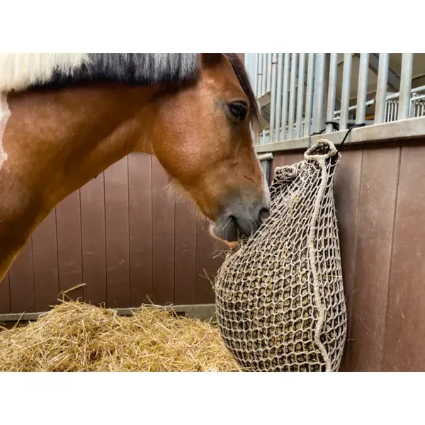 Oersterk fijnmazig hooinet dat ervoor zorgt dat het hooi langzaam opgenomen wordt.
