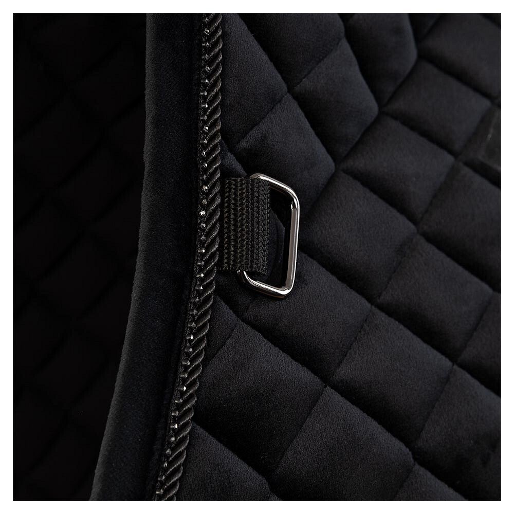 Het zadeldek heeft een fluwelen oppervlak en is omrand met een stralende koordbies, versierd met glanzende steentjes die de show stelen. De voering van het vochtregulerende Coolplus-materiaal voert effectief vocht af en houdt de paardenrug droog, zelfs tijdens intensieve trainingen.