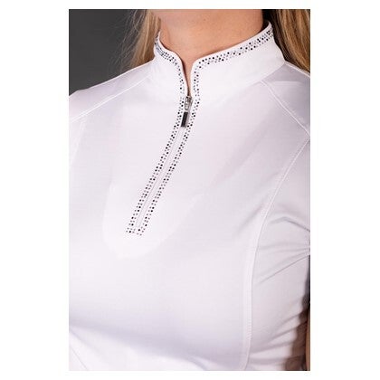 Dit elegante wedstrijdshirt met korte mouwen combineert stijl en comfort. Het shirt is voorzien van een opstaande kraag met korte ritssluiting, waarbij zowel de kraag als de ritssluiting zijn gedecoreerd met schitterende kristallen voor een luxe uitstraling tijdens wedstrijden.