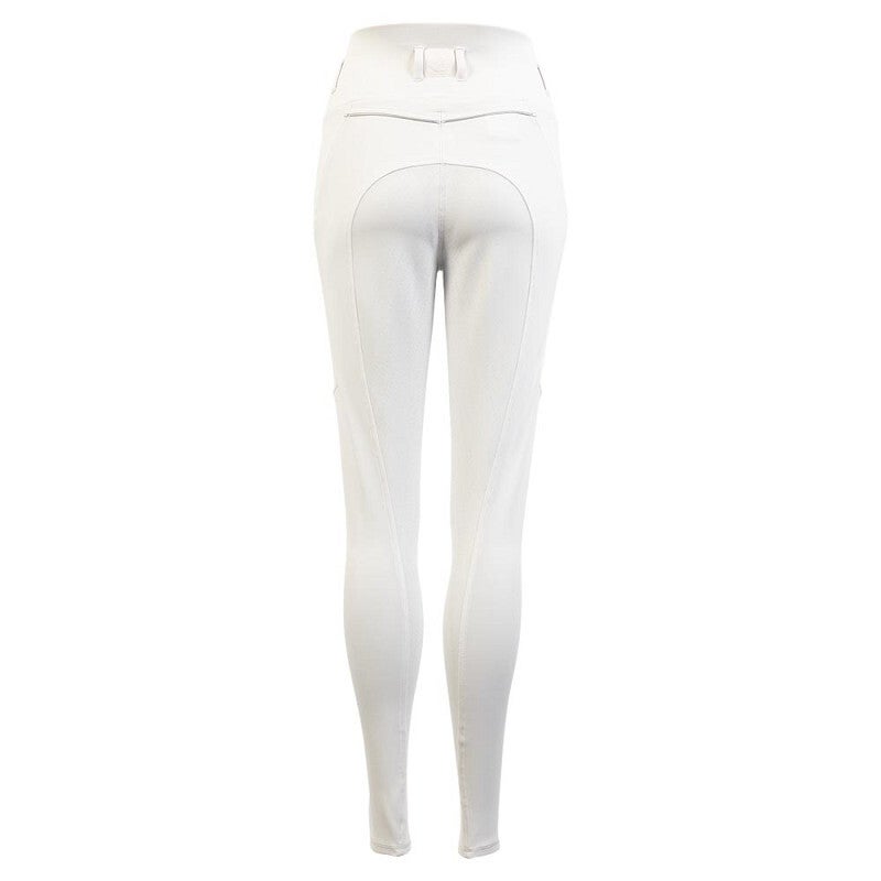 De rijlegging heeft een nauwsluitende pasvorm dankzij 4-way stretch en is afgewerkt met subtiele metallic-kleurige biezen en strass-steentjes, voor een chique en sprankelende look. De diepe zijzakken bieden ruimte voor een mobiele telefoon, terwijl het siliconen zitvlak extra grip en een stabiele zit in het zadel geeft.