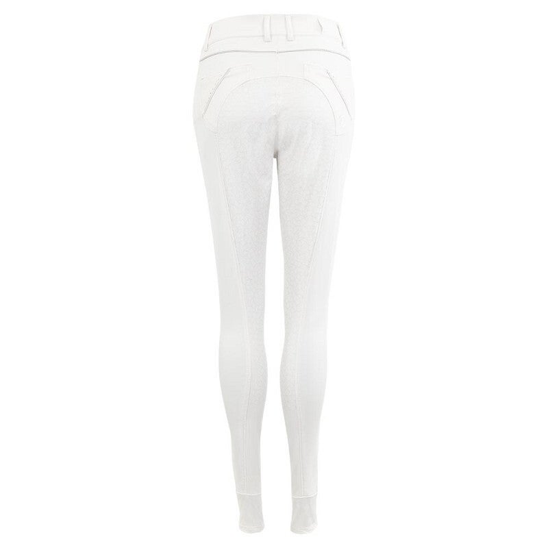 De rijbroek is afgewerkt met glanzende, zilveren details, zoals contrastbiezen en imitatiediamanten op de zakken, voor een chique uitstraling. De stretchstof, elastische tailleband en elastische beensluiting zorgen voor een perfecte pasvorm. Het siliconen zitvlak met grafisch patroon biedt extra grip en stabiliteit in het zadel.