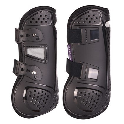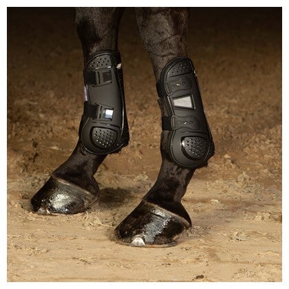 De ventilatieopeningen in de buitenschaal en de perforatie van de voering beperken de opwarming van het paardenbeen maximaal, zowel tijdens als na de inspanning. Door de anatomische vorm sluiten de peesbeschermers perfect aan bij de pezen en bieden ze zijwaartse ondersteuning tijdens de oefening.