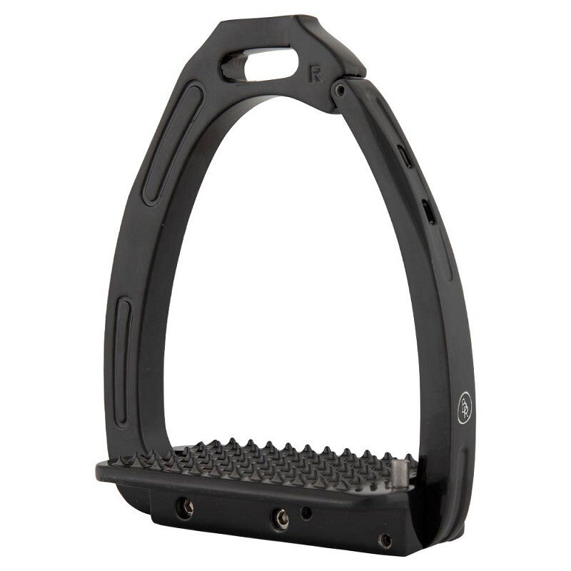 Het magnetische veiligheidsmechanisme opent de beugel bij een val, waardoor de voet niet in de beugel blijft hangen. Zodra de voet de beugel verlaat, sluit deze zich automatisch. De licht gebogen stijgbeugelriemophanging zorgt voor een correcte voetpositie, meer stabiliteit en een verbeterde beenligging voor de ruiter.