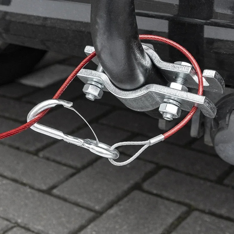 De rem- en breekkabel van de paardentrailer wordt door de sleuven van de hulpkoppeling geleid. Mocht de paardentrailer losraken van de trekhaak, dan zorgt de rem- en breekkabel ervoor dat de trailer automatisch afremt.