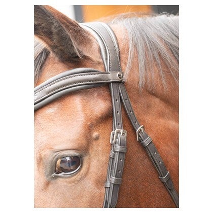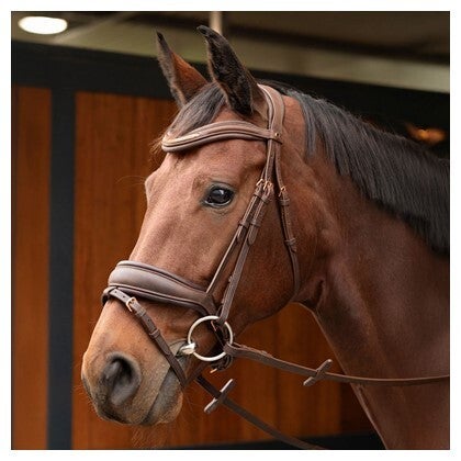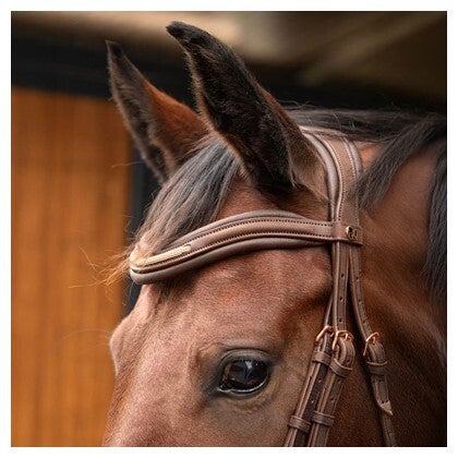 De frontriem is afgewerkt met schitterende kristallen, wat het hoofdstel een opvallende en elegante uitstraling geeft. De bruin/rosegoud en zwart/zilver combinaties maken het geschikt voor ruiters die hun outfit en paard stijlvol willen afstemmen. De teugels zijn voorzien van blinde sluitingen voor een nette en rustige afwerking.