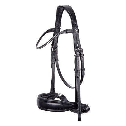 De frontriem is voorzien van schitterende kristallen, wat een luxe en verfijnde uitstraling geeft. Het hoofdstel is afgewerkt met blinde sluitingen op de bakstukken en wordt geleverd met webband teugels, waardoor het hoofdstel zowel praktisch als stijlvol is.
