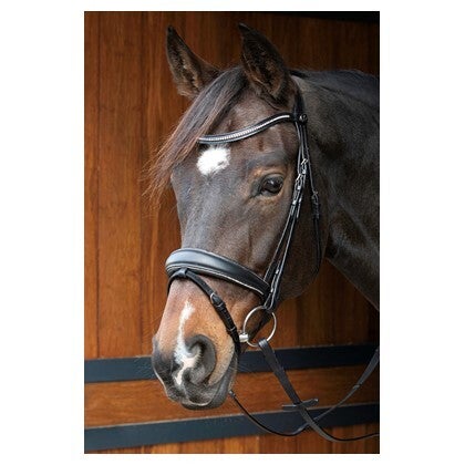 Het Hoofdstel Petit Crystal is een stijlvol lederen hoofdstel met subtiele glittersteentjes aan de onder- en bovenkant van de neusriem, waardoor het een elegante en sprankelende uitstraling heeft. De hangende, zacht onderlegde frontriem is voorzien van schitterende kristallen voor extra finesse en comfort.