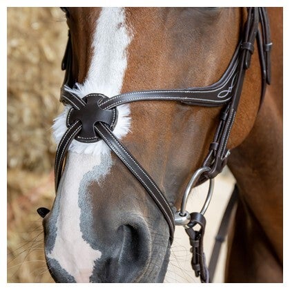 Het hoofdstel is voorzien van zachte padding en contrasterende stiksels op het kopstuk, de frontriem en de neusriem, wat bijdraagt aan zowel comfort als een luxe uitstraling. Extra zachte voering onder het midden van de neusriem zorgt voor een fijne pasvorm en vermindert druk op het gevoelige neusgebied.