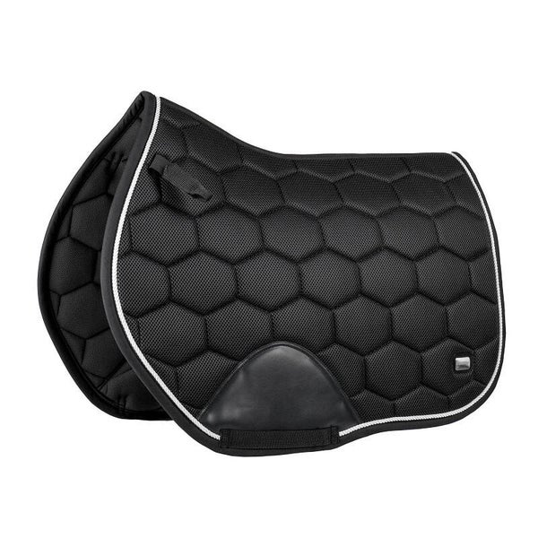 De witte parelmoerkleurige accenten geven het zadeldek een chique en verfijnde uitstraling. Daarnaast zorgen de PU versteviging bij de singel en de elastische D-ring bevestiging voor extra functionaliteit en duurzaamheid.