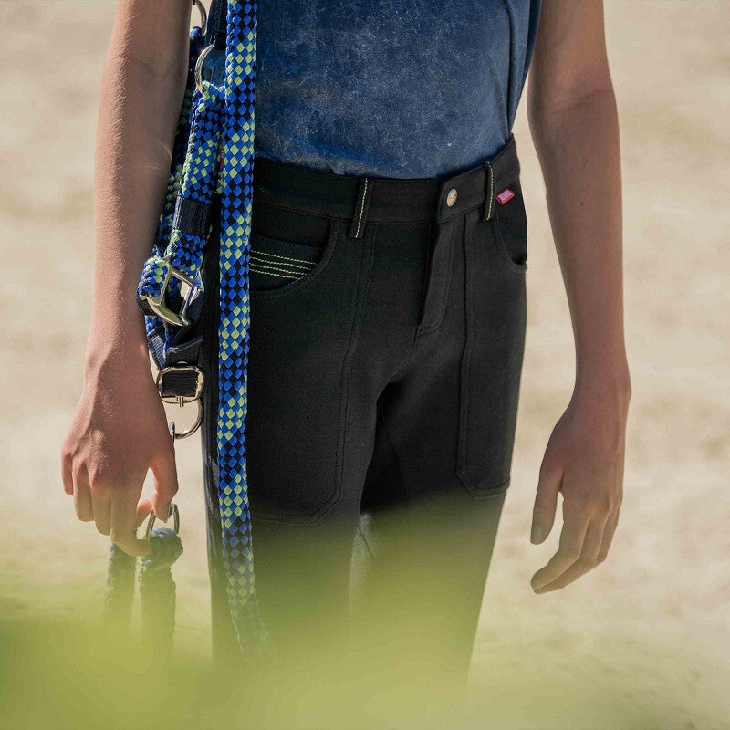 Jongens rijbroek met jeanszakken en contrastkleurige accenten.